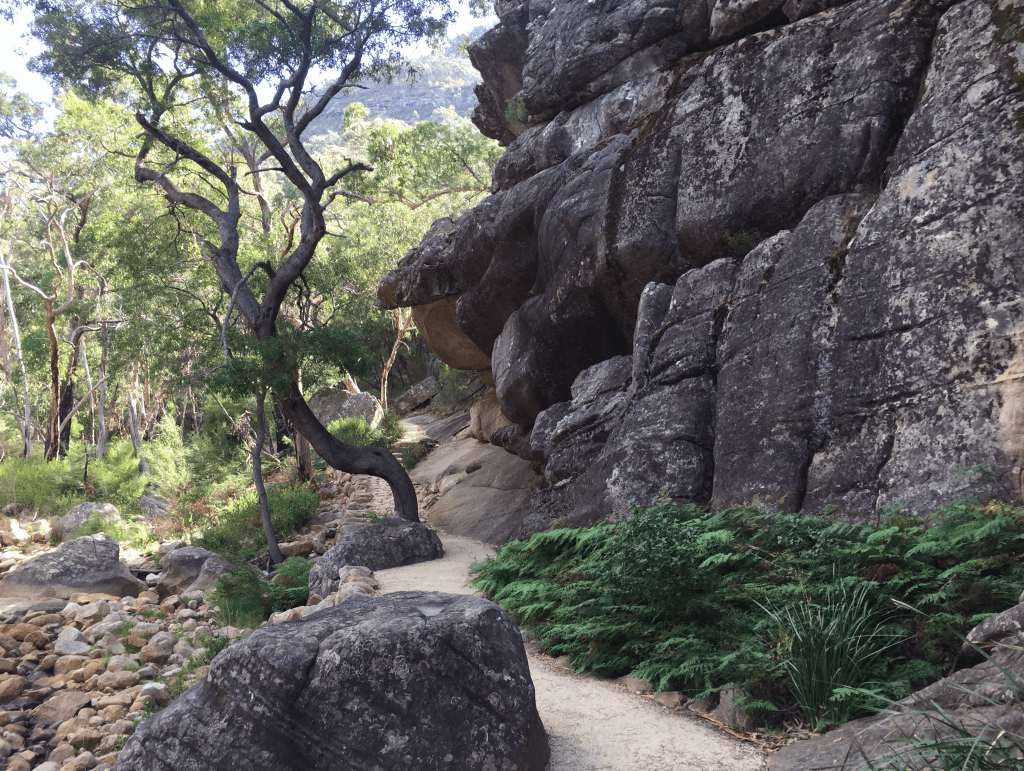 Got to the Wonderland Car Park and then started to climb up to the Pinnacles. I took a wrong turn and instead of ascending I descended deeply and went down through what is called “The Grand Canyon” which was a significant descent through an iconic rock form of the Grampians. But it brought me back to the Wonderland Car Park, which I had left some time before. As it was now getting late I did not finish the rest of the section by foot but Ruth drove me up to the Rosea Car Park where we had intended to meet for a water drop. I then walked in to the Bugiga Campsite where I stayed the night. Ruth went back to her motel at Halls Gap.