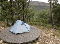 The 11 campsites are wooden platforms set above the environment, which can take a two-person tent. They have anchor points and a storage cage.